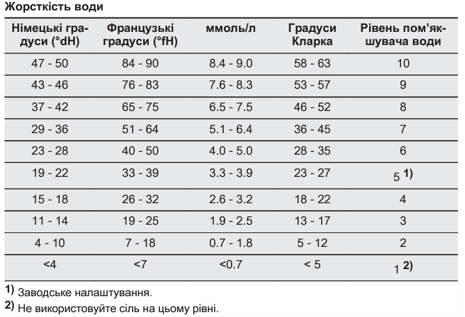 За додатковою інформацією щодо правильного встановлення рівня жорсткості води зверніться до керівництва користувача. Керівництво користувача можна завантажити тут.